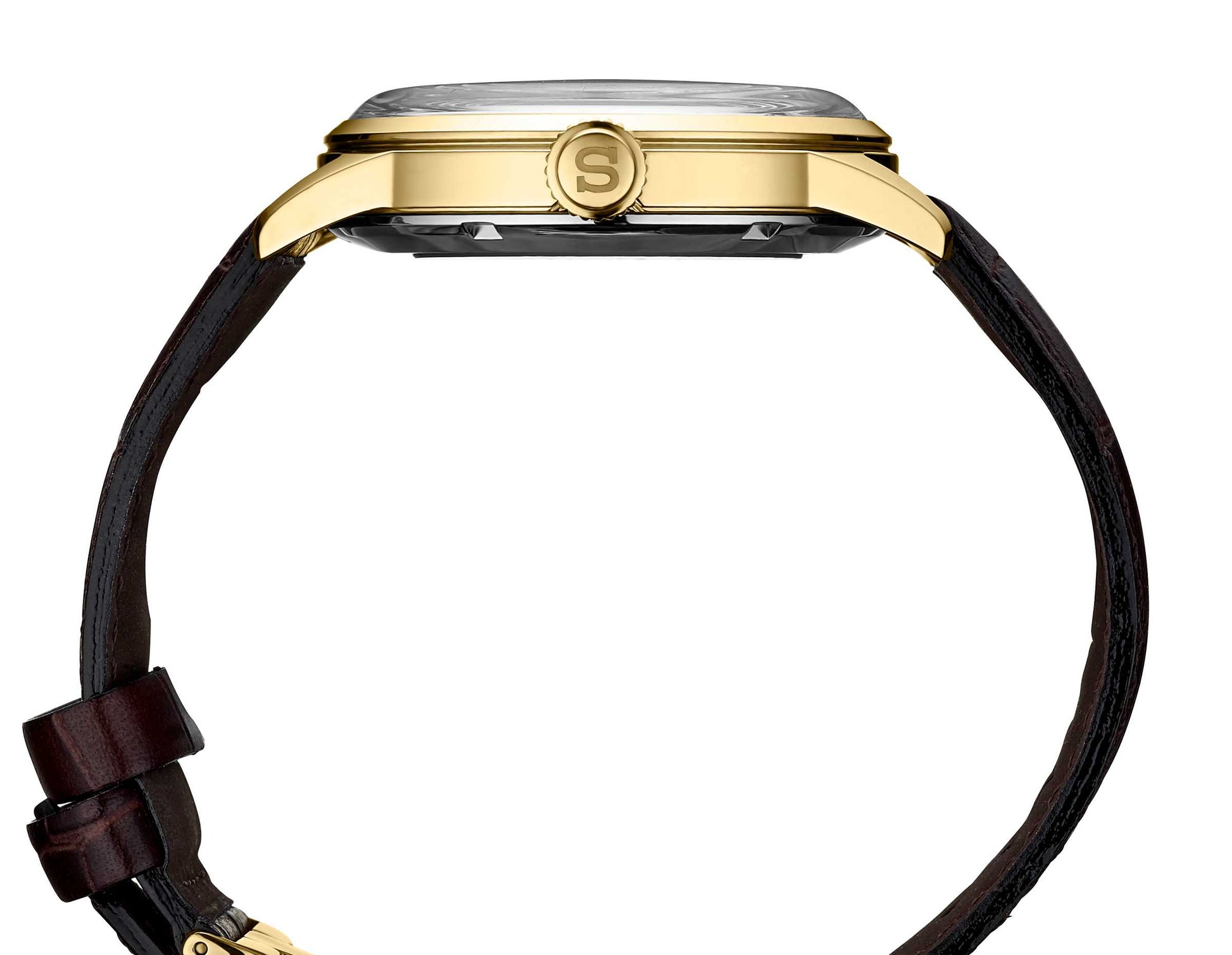 The Presage Collection by SEIKO combines mechanical excellence with sleek svelte design. Inspired by the glamorous jet-set cocktail bars of Tokyo with slim polished markers and delicate curved hands reminiscent of a martini glass. The SRPB46 features a pressed sunray patterned gradient chocolate brown glossy dial behind a boxed shaped hardlex crystal. The 40.5mm polished rose-gold PVD coated stainless steel case is powered by SEIKO's own 4R35 caliber movement with a see-through exhibition case-back and 41 hour power reserve. The faceted polished diamond shaped markers with razor sharp sword style hands are surrounded by a sleek minutes track. Fitted with a polished generous sized easy-grip rose-gold PVD coated stainless steel crown with 50 meter water resistance rating. Finished with an alligator grained glossy brown calf-skin leather strap with matching stitch and polished rose-gold PVD coated stainless steel twin push button bi-fold deployment clasp to secure in place.