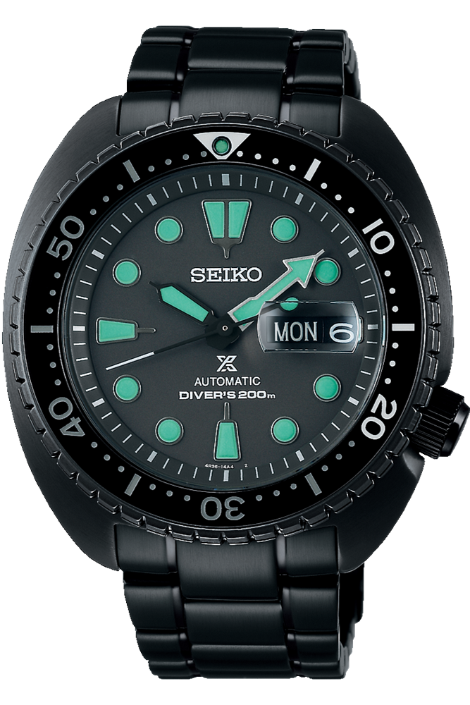 The Seiko PROSPEX Collection, a cult favorite among watch enthusiast from all over the world combining durability with sporty style. Part of the Black Series, inspired by night vision scopes, featuring long-lasting bright vivid Lumibrite green against an all black dial. The SRPK43 automatic black PVD coated stainless steel 45mm case has a black satin dial and ceramic rotating uni-directional 120 click elapsed timing bezel. Equipped with a magnified double day/date window @3 and luminous vivid green hands and appendages with white tipped seconds hand makes this wrist watch easily readable in any environment. The screw-down crown is strategically positioned at 4:00 for comfort with a 200 meter water resistance rating. Powered by Seiko's own in-house-made automatic caliber 4R36 movement with a 41 hour power reserve. Fitted with a black PVD coated stainless steel brushed and polished 3-link bracelet with deployment butterfly safety clasp adjustable by 5 positions will keep your watch secure and in place.