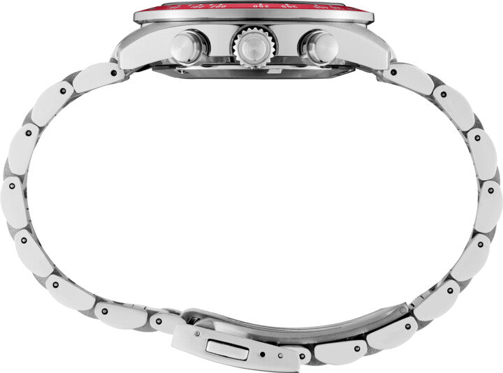 • Red aluminum stainless steel tachymeter bezel with white printed numbers