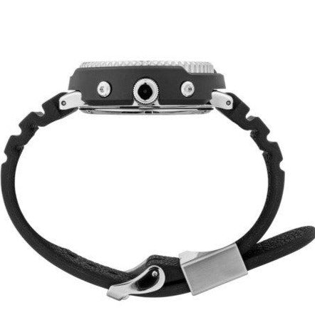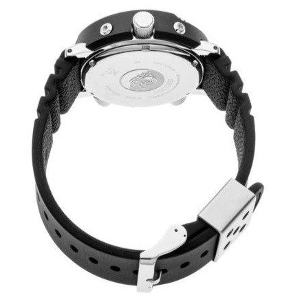 This Seiko PROSPEX "Street Series" is just the latest modern innovation and interpretation of Seiko's retro "arnie" 1982 diver’s watch with an updated new urban sporty style.  The SNJ025 wristwatch is a diving piece with a 200 meter water resistance, black aluminum rotating uni-directional 120 click elapsed timing bezel and screw down crown that meets ISO standards for scuba diving. The 47.8mm stainless steel case has a light-weight high-tech protective shell exterior with decorative metal rivets. Equipped with a digital alarm function, LED lighting and black matte dial with high-visible luminous hands, markers and appendages makes this wrist watch easily legible in any environment. The chronograph measures up to to 100 hours in 1/100 second increments with full-auto calendar correct to December 31, 2100.  Seiko's own in-house movement caliber H851 is powered by light which uses direct sunlight or ambient light. Once fully charged your timepiece has a 6 month power reserve (no need for a battery) for low easy maintenance. Fitted with a matte black rubber silicone accordion shaped strap with tang buckle and brushed stainless steel safety keeper to keep your watch secure and in place.