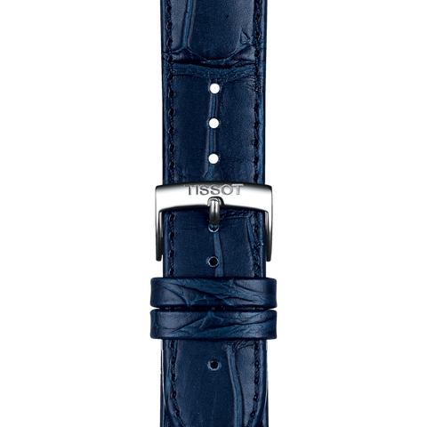 Part of the T-CLASSIC Collection, the Carson Premium Series from the Tissot Watch Brand has classic dashing design, with a combination of simplicity and elegances of a quality Swiss timepiece. The moonphase battery operated quartz Model #T122.423.16.043.00 has a 40mm polished stainless steel case with polished bezel and blue sun-brushed dial. Featuring a moonphase window @6 surrounded by oversize black Roman numerals are easily legible under a scratch resistance sapphire crystal. Fitted with delicate blue leaf shaped hands and a date window featured @3 with a polished push-pull crown and 50 meter water resistance rating. Finished with an alligator grained calf-skin leather strap with matching stitch and stainless steel pin buckle clasp with Tissot emblem.