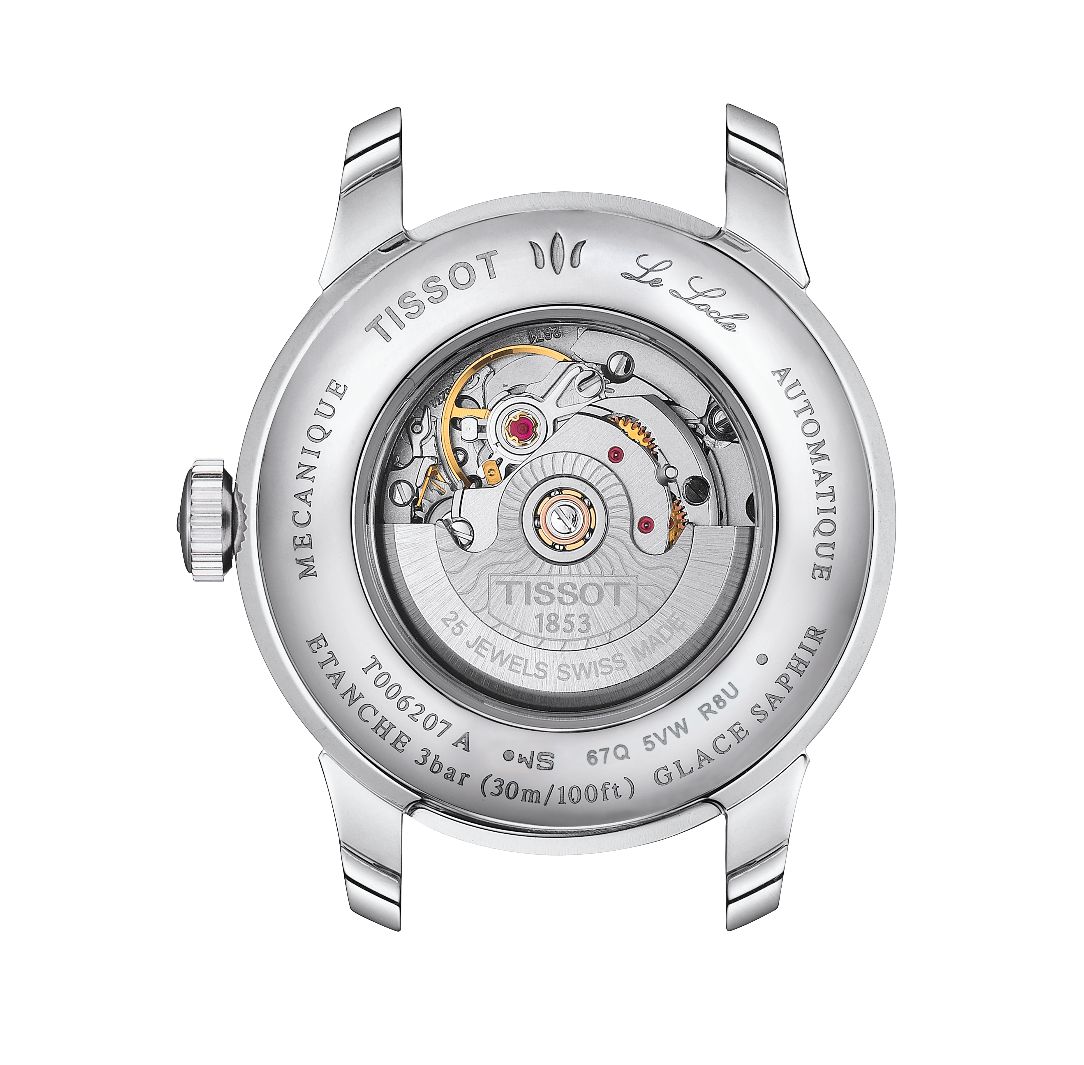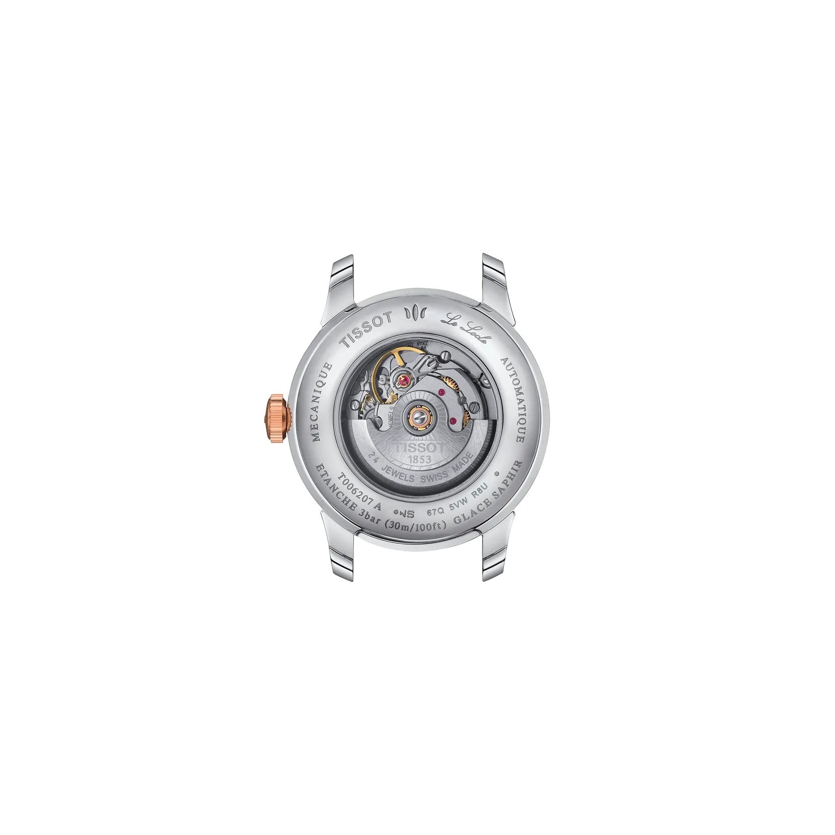 Case back Polished stainless steel exhibition case-back displaying movement with engraved Tissot Le Locle emblem