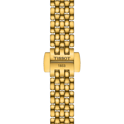 Part of the T-LADY Collection, the Lovely Series from the Tissot Watch Brand is inspired by the small, delicate watches of the 1960's with feminine details and subtle style, to be worn like a paired piece of jewelry or a key piece on its own. The ladies battery operated quartz model #T140.009.63.026.00 has a 19.5mm gold-tone PVD coated stainless steel case has a polished fixed circular diamond encrusted bezel. The gold-tone sun-brushed dial features four genuine diamond markers surrounded by pencil shaped hands under a scratch resistant sapphire crystal. Fitted with a gold-tone PVD coated stainless steel push-pull crown with 30 meter water resistance rating. Finished with a brushed and polished gold-tone PVD coated stainless steel 5-link bracelet with bi-fold deployment safety clasp with Tissot emblem.