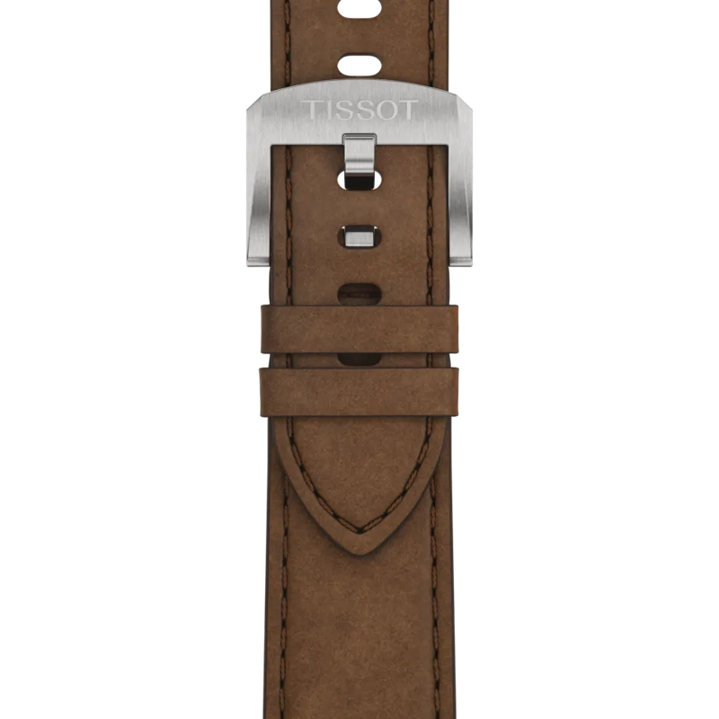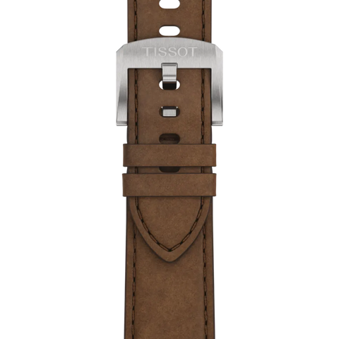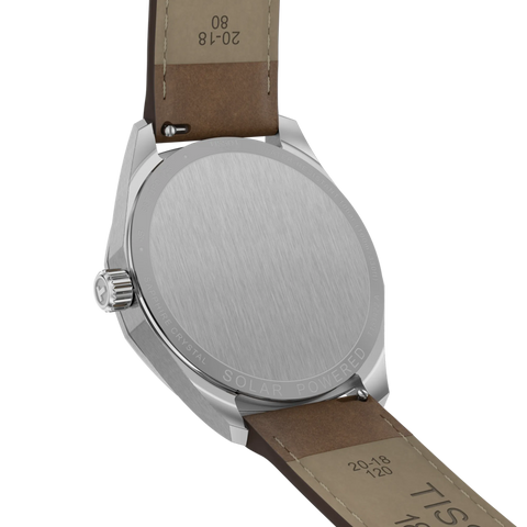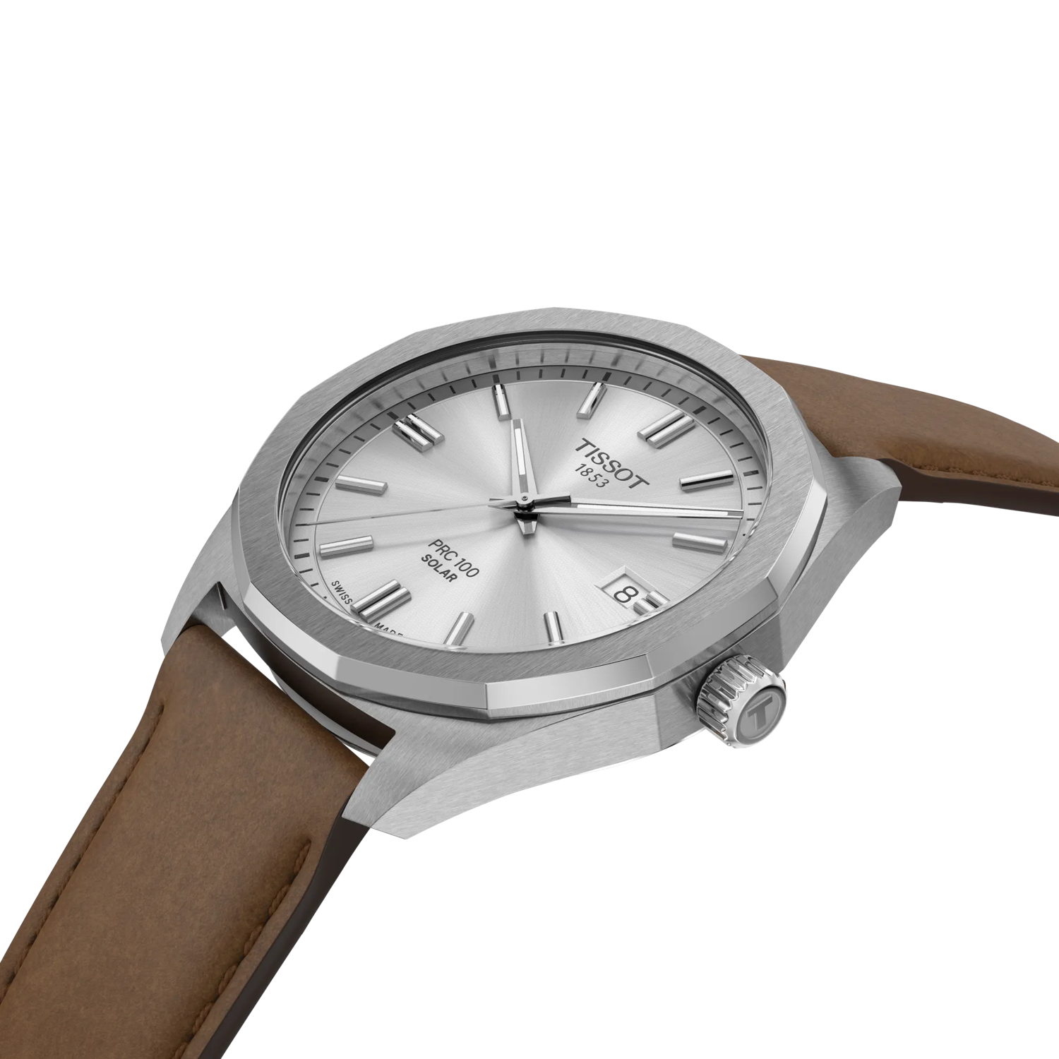First introduced in the mid-2000s, the PRC 100 was recognised for its striking design within the Tissot Brand. Now the new Solar Series carries the precision of a quartz timepiece, reimagined through the Lightmaster technology harnessing the power of artificial and natural light. With a 14-month power reserve capacity, an EOE function will easily indicates the need for effortless charging. The 39mm polished stainless steel case, model #T151.422.16.031.00, has a sun-brushed silver dial with fixed octagonal bezel.  Luminous paddle shaped hands and applied easily legible stick indices are surrounded by a minutes track. A date window @3 is viewable behind a scratch resistant sapphire crystal. Equipped with a polished stainless steel ridged oversize easy-grip crown with 100 meter water resistance rating. Finished with a brown smooth calf-skin leather strap with matching stitch and stainless steel pin buckle clasp with Tissot emblem.