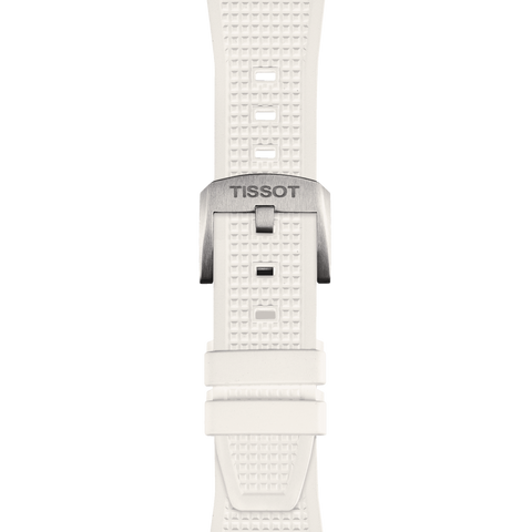 Part of the T-CLASSIC Collection, the PRX Series from the Tissot Watch Brand has sleek , smooth designs inspired by 1970's style, with modern innovations. The PRX Quartz Model #T137.410.11.011.00 has a brushed and polished 40mm stainless steel tonneau shaped case with a white vertical sun-brushed dial. Applied luminous slim stick markers are surrounded by a minutes track. Luminous baton style hands and date window @3 are easily readable behind a circular scratch resistant anti-reflective sapphire crystal. Equipped with a polished ridged domed push-pull crown and 100 meter water resistance rating. Fitted with a white textured rubber strap with brushed and polished stainless steel tang pin-buckle clasp closure with Tissot emblem.