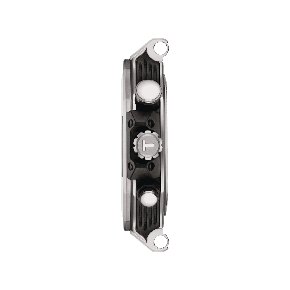 • Split stainless steel corrugated crown with black ring accent with Tissot logo encompassed in black coated casing