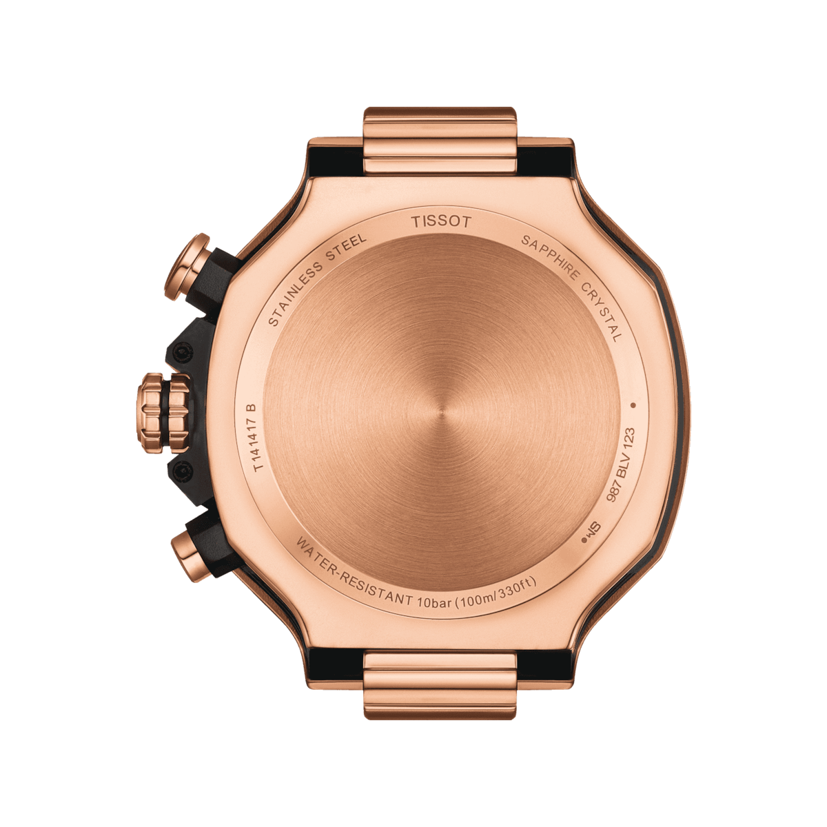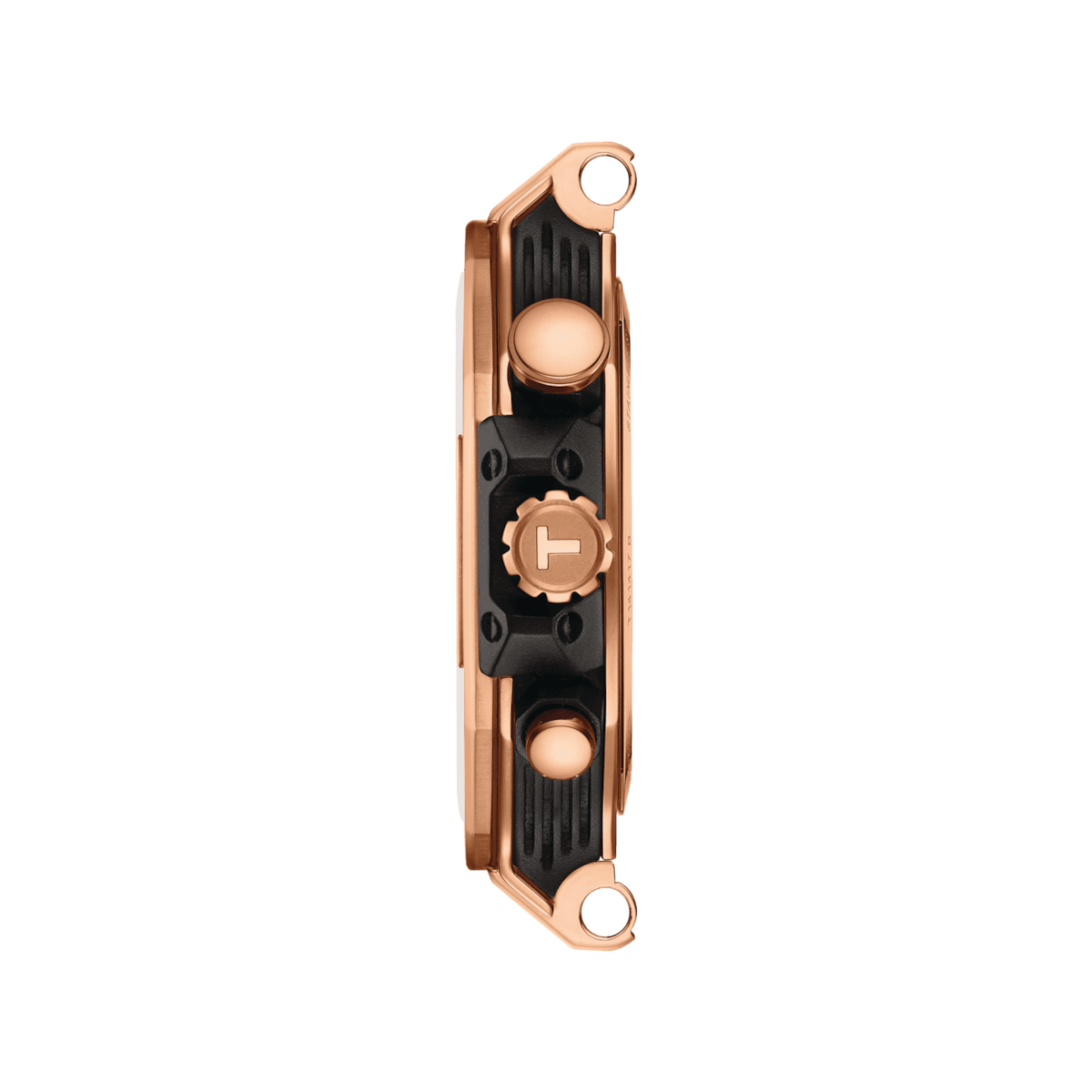 • Split rose-tone PVD coated stainless steel corrugated crown with black ring accent with Tissot logo encompassed in black coated casing