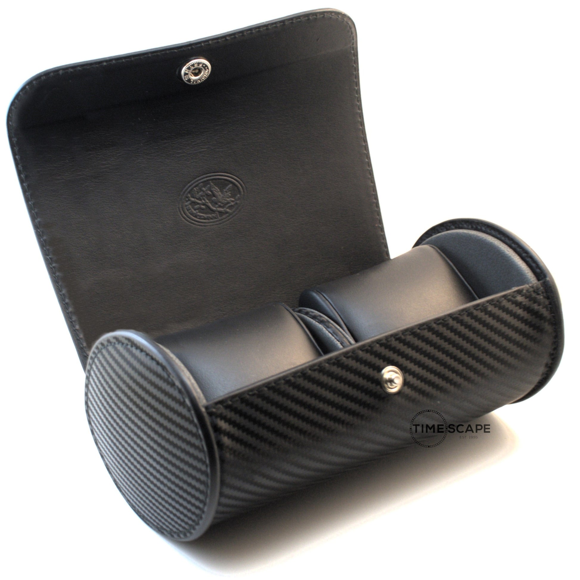 Renowned for exquisite storage cases, watch winders and accessories, Underwood (London) is luxury leather goods manufacturer located in Italy. The UN231 Collection is a finely crafted, quality leather watch storage container for traveling and protecting your fine timepieces. Made with a textured woven carbon fiber exterior, the double round watch case is hand stitched with polished chrome hardware. The interior has removable padded pillows with pillow divider lined with a special micro-fiber fabric to prevent oxidation of your wrist watches. A snap button closure will secure your items in place during transport.