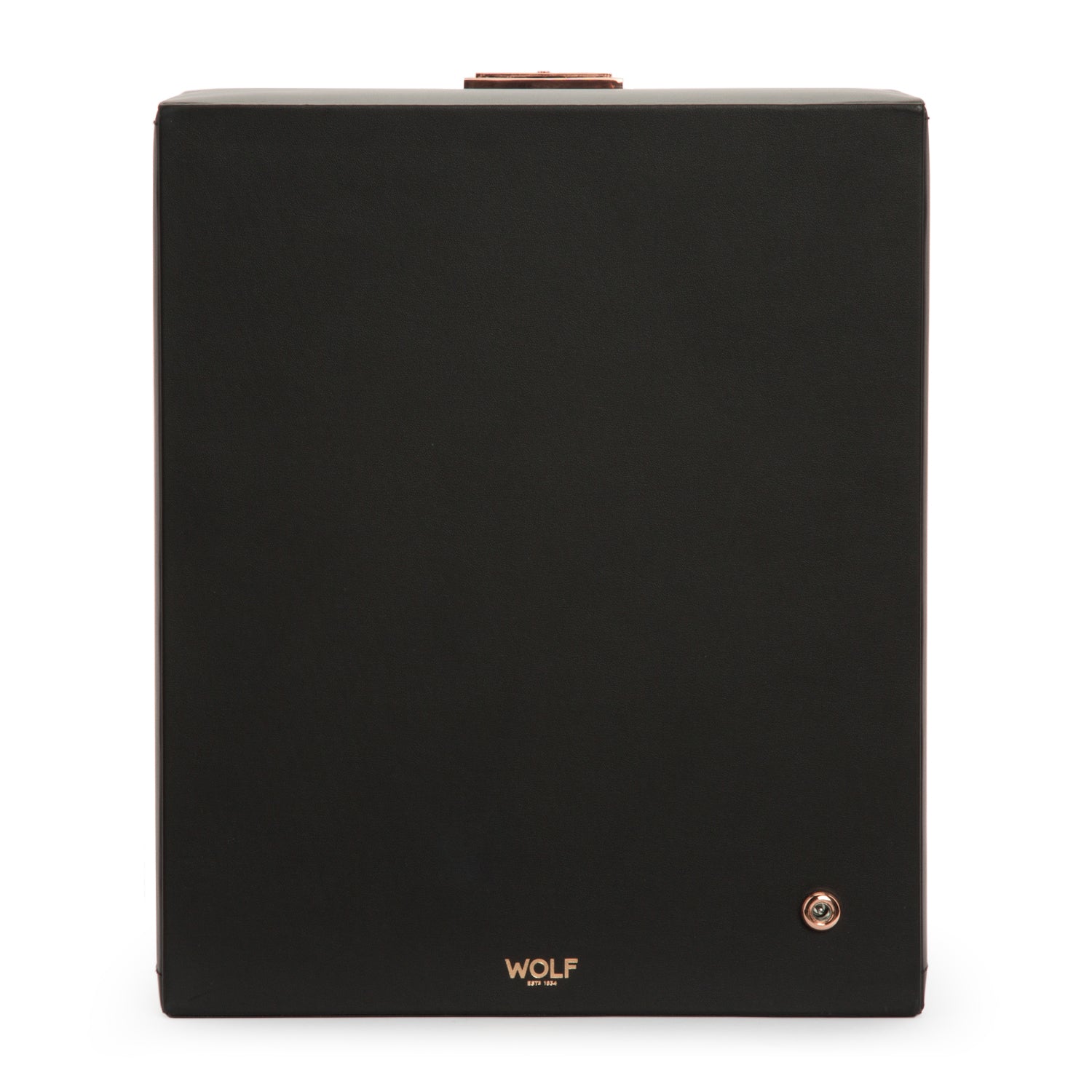 The Axis Collection by the brand Wolf est. 1834 is a modern, bold winding and storage system that incorporates steampunk style metals. The 4-unit watch winder with storage has a curved frame covered in a vegan leatherette exterior with polished chrome hardware and lockable case. The flip down cover has a tempered glass window that beautifully displays your timepieces while winding. The interior has a decorative laser cut grated screen faceplate front with back-lit LCD winding displays. Large removable micro-suede cuffs will accommodate watches up to 52mm in size. The winding system is programmable with 300-1200 TPD (turns per day), start/delay mode and clockwise, counter clockwise and bi-directional rotations. Powered by batteries or use the AC power adapter provided.