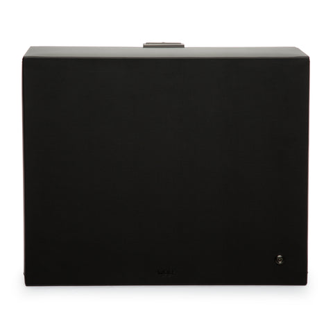 The Axis Collection by the brand Wolf est. 1834 is a modern, bold winding and storage system that incorporates steampunk style metals. The 6-unit watch winder has a curved frame covered in a vegan leatherette exterior with chrome hardware and lockable case. The flip down cover has a tempered glass window that beautifully displays your timepieces while winding. The interior has a decorative laser cut grated screen faceplate front with back-lit LCD winding displays. Large removable micro-suede cuffs will accommodate watches up to 52mm in size. The winding system is programmable with 300-1200 TPD (turns per day), start/delay mode and clockwise, counter clockwise and bi-directional rotations.  Powered by an AC power adapter provided.