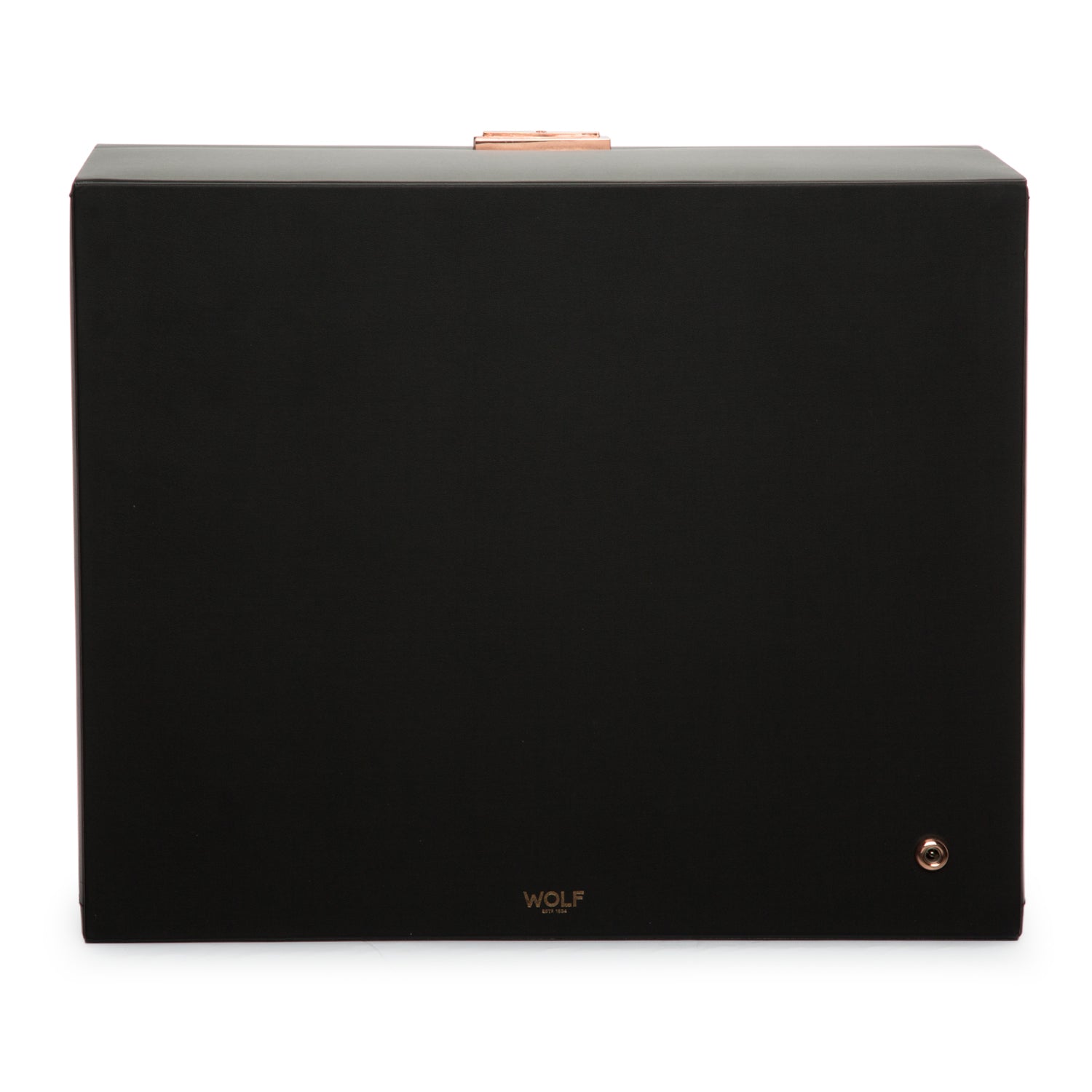 The Axis Collection by the brand Wolf est. 1834 is a modern, bold winding and storage system that incorporates steampunk style metals. The 6-unit watch winder with storage has a curved frame covered in a vegan leatherette exterior with polished chrome hardware and lockable case. The flip down cover has a tempered glass window that beautifully displays your timepieces while winding. The interior has a decorative laser cut grated screen faceplate front with back-lit LCD winding displays. Large removable micro-suede cuffs will accommodate watches up to 52mm in size. The winding system is programmable with 300-1200 TPD (turns per day), start/delay mode and clockwise, counter clockwise and bi-directional rotations. Powered by batteries or use the AC power adapter provided.