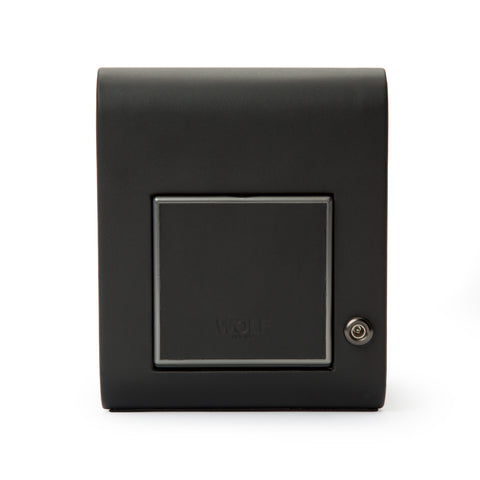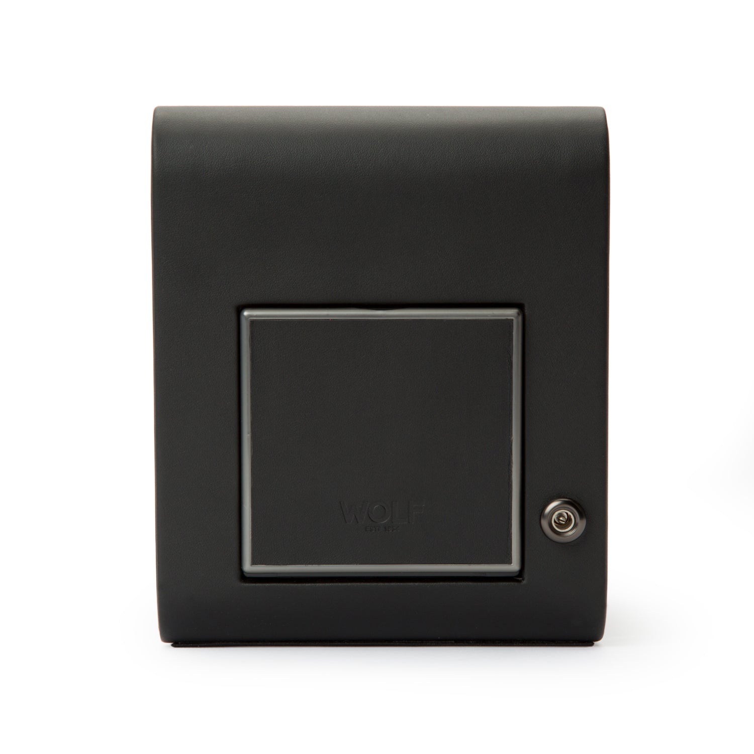 The Axis Collection by the brand Wolf est. 1834 is a modern, bold winding and storage system that incorporates steampunk style metals. The single watch winder has a curved frame covered in a vegan leatherette exterior with chrome hardware and lockable case. The flip down cover has a tempered glass window that beautifully displays your timepiece while winding. The interior has a decorative laser cut grated screen faceplate front with a back-lit LCD winding display. A large removable micro-suede cuff will accommodate watches up to 52mm in size. The winding system is programmable with 300-1200 TPD (turns per day), start/delay mode and clockwise, counter clockwise and bi-directional rotations.  Powered by batteries or use the AC power adapter provided.