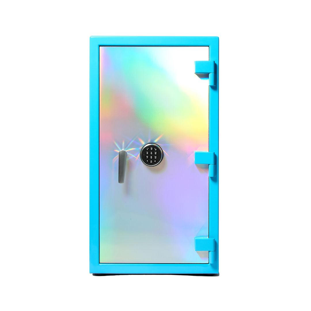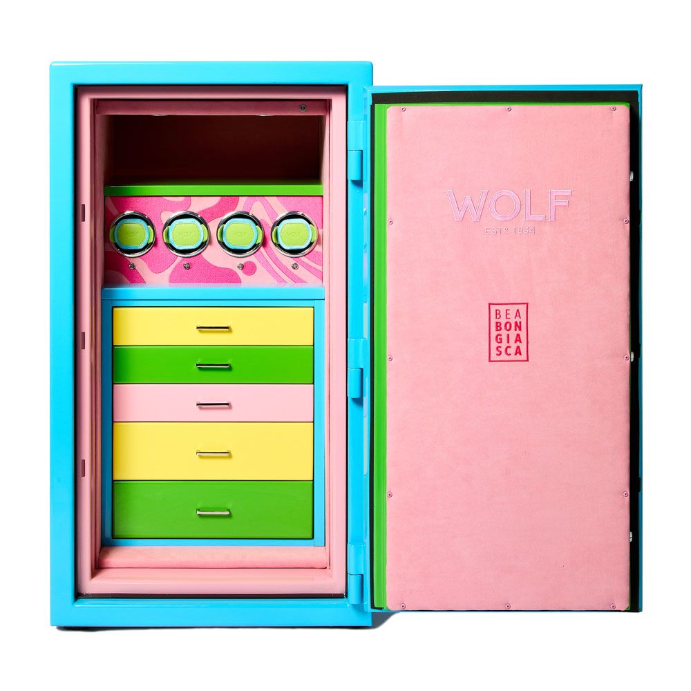 The Bea Bongiasca Collection is inspired by the eclectic Italian jewelry designer by the same name from the WOLF 1834 Brand. Taking inspiration from the world of Pop-art with contemporary colors and design, the watch winding and storage safes offer premium protection and security incorporating playful fun with style. Certified by the UL (Underwriters Laboratory), and equipped with a Palusol® fire sealed door with keypad combination lock your valuables will be safe within. The 4-unit watch winding safe is composed of an armored plated steel frame painted with high gloss iridescent lacquered finish and with polished chrome hardware. The interior has several colorful vegan leather covered storage drawers lined in a soft decorative embroidered micro-suede with a variety of interior storage compartment combinations. Fitted with 4 removable bi-colored watch cuffs to accommodate watches up to 52mm in size is easily viewable with interior LED lighting.