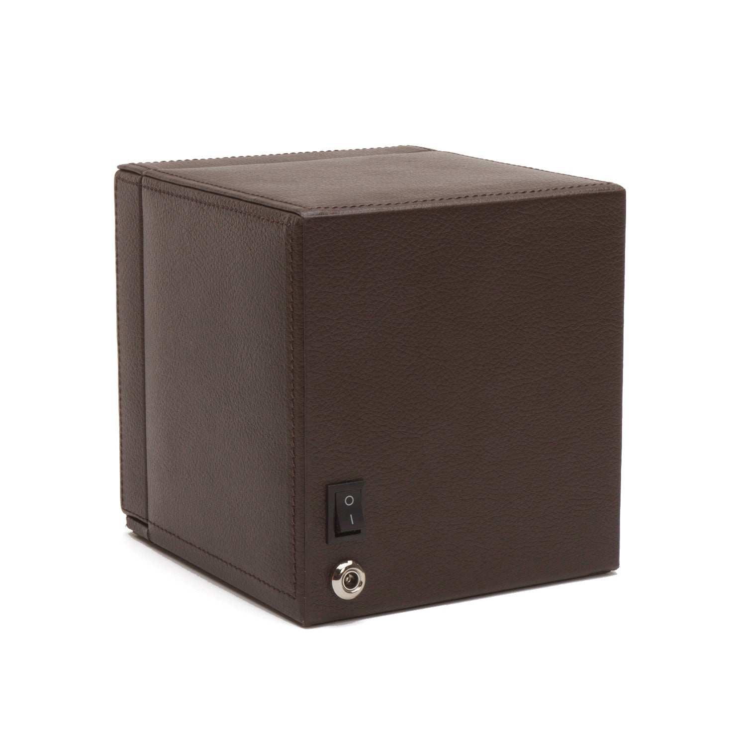 The Cub Collection by Wolf is an affordable solution to a quality entry level watch winder with a classic design that comes in several colors. The single watch winder is covered in a pebble grained leatherette exterior with matching stitch. Fitted with a flip down acrylic glass cover with soft grosgrain fabric interiors. Polished chrome hardware with large removable cuff will accommodate watches up to 52mm in size. Featuring an LED battery indicator on/off light powered by batteries or optional A/C power adapter. Pre-programmed intermittent winding system with bi-directional rotations and pause/sleep modes with 900 TPD (turns per day),