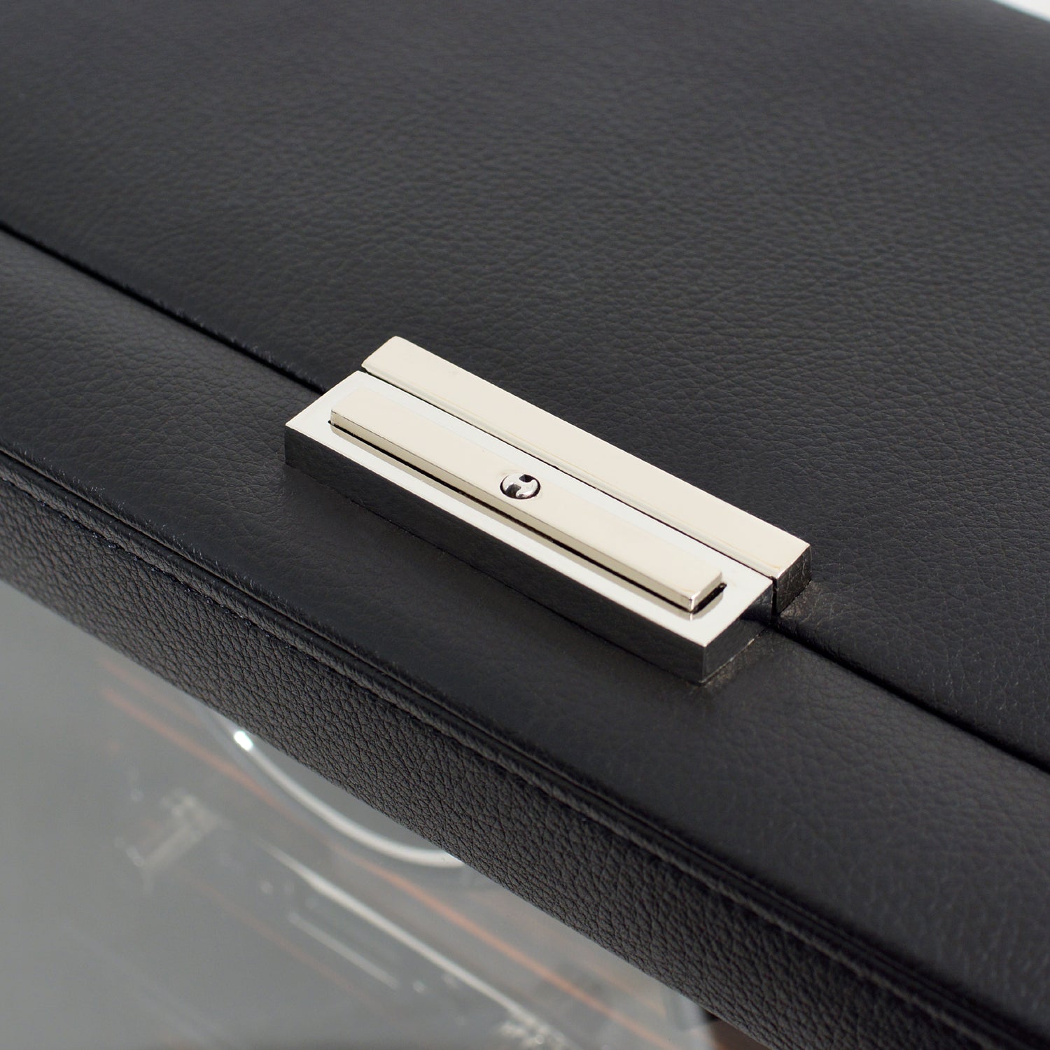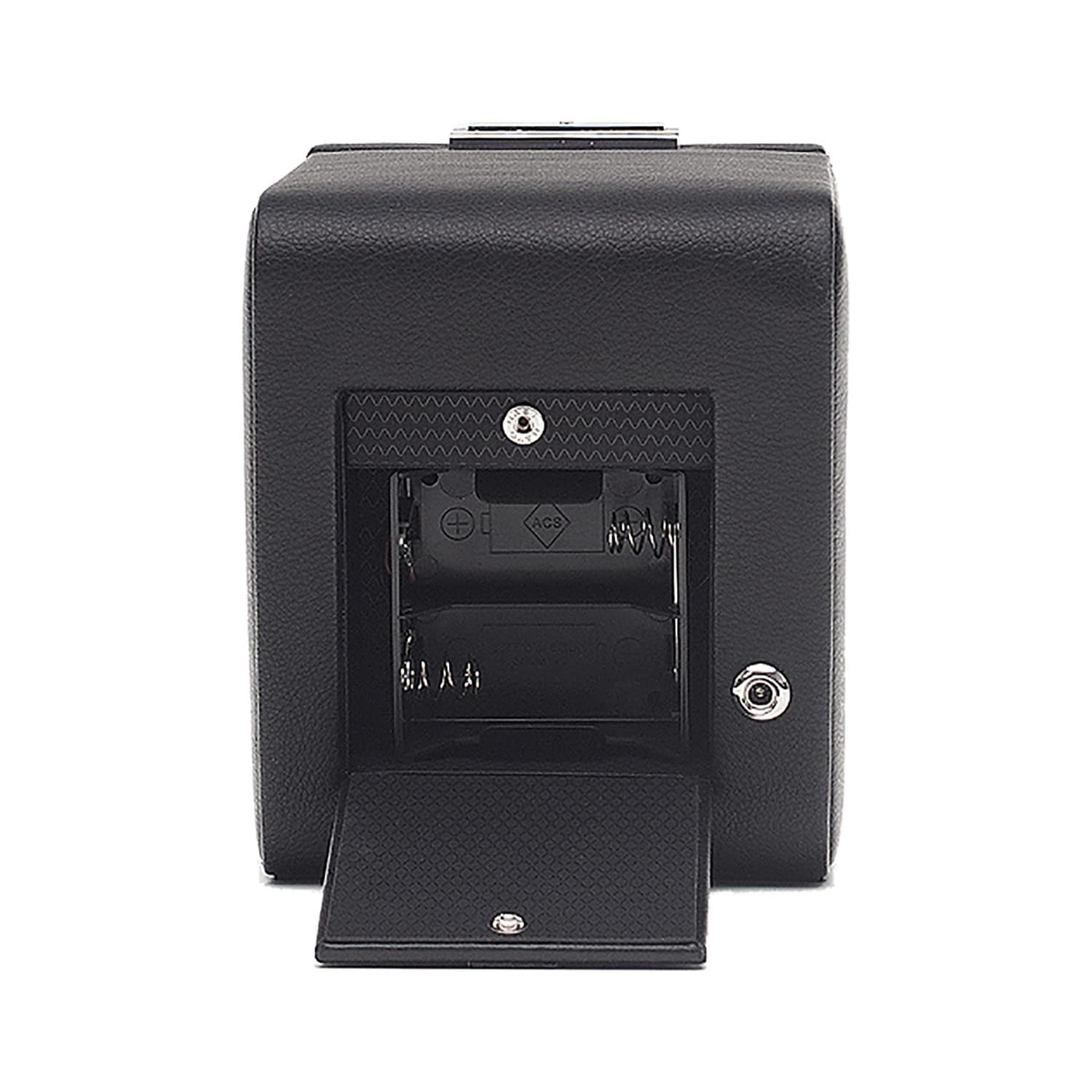 The Roadster single-unit watch winder is covered in a pebble grained padded leather with a protective glass cover. The lockable frame with a tempered glass window beautifully displays your timepiece while winding. A luxurious hi-gloss lacquered macassar wood interior is accented by polished chrome hardware. The watch winder is equipped with a large removable cuff to accommodate watches up to 52mm in size. Battery operated with battery indicator on/off light or choose the optional AC power adapter included. Equipped with clockwise, counter-clockwise and bi-directional rotations with start/delay mode. Winding operation from 300-1200 TPD (turns per day) with back-lit LCD display.
