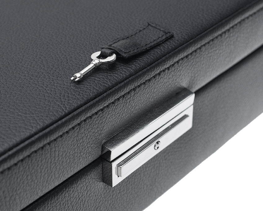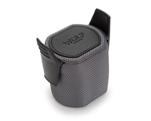 The Classic (formally known as Viceroy) by Wolf is a diverse winding and storage system with single and multi-unit configurations for your timepiece collection. The 9-unit watch winder is covered in a lush pebble grained black faux leather with polished chrome hardware and lockable cover. The flip down frame has a tempered glass window that beautifully displays your timepiece while winding. The interior is lined in a luxurious textured silver silk fabric with large removable cuffs to accommodate watches up to 52mm in size. Powered by AC adapter wall plug with power indicator on/off light. Equipped with clockwise, counter-clockwise and bi-directional rotations with start/delay mode. Winding operation from 300-1200 TPD (turns per day) with back-lit LCD display.